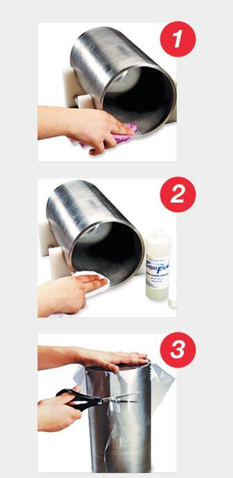 Liquifilm的工作原理清潔 清潔管道內(nèi)部,去除表面的污染物 涂抹 將Liquifilm水溶性粘合劑涂抹到管道內(nèi)側(cè)。涂抹管道表面需貼膜的整個圓周。 追蹤與切割 用Liquifilm沿著管道邊緣按壓,留下一個壓痕,以追蹤管道的內(nèi)徑。然后將其折疊成90°角。在壓痕周圍,以管道直徑約三分之一倍的尺寸,將Liquifilm剪成一個圓形。 壓 將Liquifilm的光滑表面壓在管道內(nèi)粘稠的粘合劑上,以形成氣密密封。如有需要,可在清洗擋板的中心刺一個小孔,使氧氣通過根部間隙逸出或消散。 |